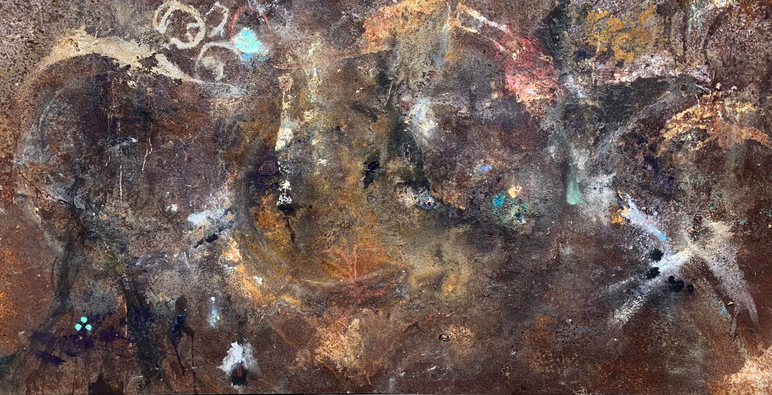 Key West / Immortality, 2016 – 2025, 122 x 218 cm, acrylic, ink, charcoal, and organic material on steel.